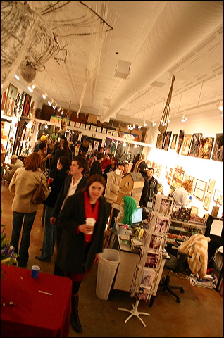 Above head shot from rear of gallery. Andy Faith piece hangs from ceiling, left.